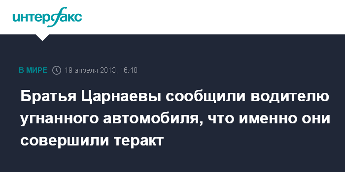 Вашингтон. 19 апреля. INTERFAX.RU - Братья Джохар и Тамерлан Царнаевы, сообщили водителю угнанного ими автомобиля, что именно они стоят за взрывами на марафоне в Бостоне, передает в пятницу американский телеканал CNN.