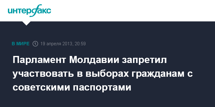 Кишинев. 19 апреля. INTERFAX.RU - В Молдавии запретили участие в выборах граждан, которые не обменяли советские паспорта на молдавские удостоверения личности. Такой закон был принят в пятницу парламентом республики.