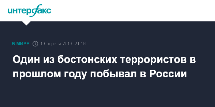Москва. 19 апреля. ИНТЕРФАКС - Тамерлан Царнаев - один из предполагаемых организаторов двойного теракта на Бостонском марафоне, в прошлом году летал в Россию из Нью-Йорка. За пределами США Царнаев, убитый полицейскими при попытке задержания рано утром в пятницу, провел около полугода, сообщает телеканал NBC New York.