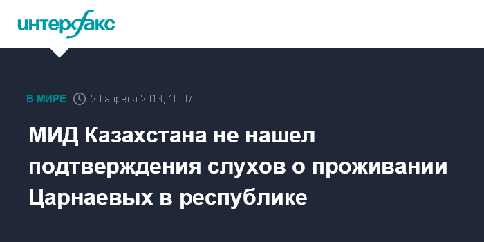 Астана. 20 апреля. INTERFAX.RU - МИД Казахстана не нашел подтверждения, что подозреваемые в причастности к взрывам во время бостонского марафона братья Тамерлан и Джохар Царнаевы проживали в республике. "Нам известно, что средствами массовой информации распространяются противоречивые сведения в отношении событий в Бостоне", - говорится в распространенном в субботу заявлении МИД.