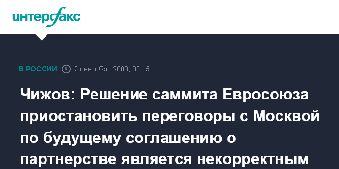 Москва/Брюссель. 1 сентября. ИНТЕРФАКС - Постпред России при ЕС Владимир Чижов назвал некорректным и не по адресу политическим сигналом решение саммита Евросоюза приостановить переговоры с Москвой по будущему соглашению о партнерстве.