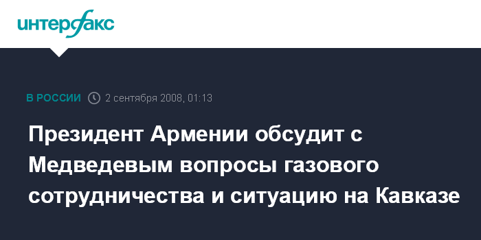 Накануне источник в Кремле сообщил "Интерфаксу", что в ходе предстоящих переговоров Д.Медведев намерен проинформировать С.Саргсяна о российской оценке ситуации, сложившейся после агрессии Грузии в отношении Южной Осетии.