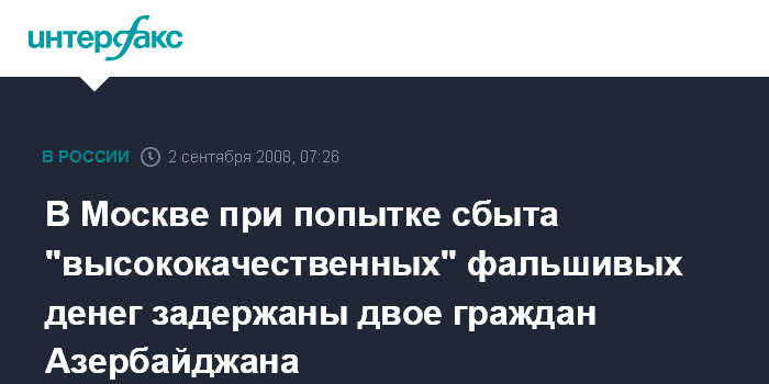 Москва. 2 сентября. ИНТЕРФАКС-МОСКВА - В Москве задержаны двое граждан Азербайджана, пытавшихся сбыть фальшивые деньги.