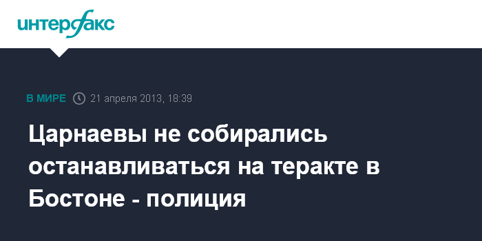 Вашингтон. 21 апреля. INTERFAX.RU - Джохар и Тамерлан Царнаевы, подозреваемые в организации взрывов на финише бостонского марафона, наверняка планировали совершить новые теракты, заявил в воскресенье начальник полиции Бостона Эдвард Дэвис. "Они собирались совершить новые нападения на людей", - сказал он в эфире телеканала Си-Би-Эс. По словам полицейского, к такому выводу он пришел, принимая во внимание, что в распоряжении братьев Царнаевых был внушительный арсенал оружия и взрывчатки.