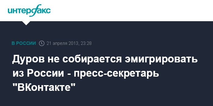 Москва. 21 апреля. ИНТЕРФАКС - Пресс-секретарь соцсети "ВКонтакте" Георгий Лобушкин на своей странице опроверг сообщения российских СМИ о том, что создатель и глава соцсети Павел Дуров эмигрировал в США.