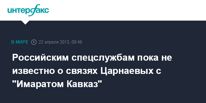 Москва. 22 апреля. INTERFAX.RU - Информация о возможных контактах братьев Царнаевых, которых в США подозревают в организации терактов в Бостоне, к экстремистской группировке "Имарат Кавказ", будет проверяться, однако достоверных данных об этом в настоящее время нет, сообщил "Интерфаксу" источник в силовых структурах РФ.