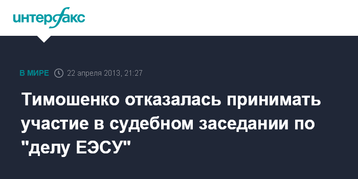 Киев. 22 апреля. INTERFAX.RU - Осужденная экс-премьер Украины Юлия Тимошенко написала заявление об отказе участвовать в судебном заседании Киевского районного суда Харькова по делу о злоупотреблениях корпорации "Единые энергетические системы Украины" (ЕЭСУ).