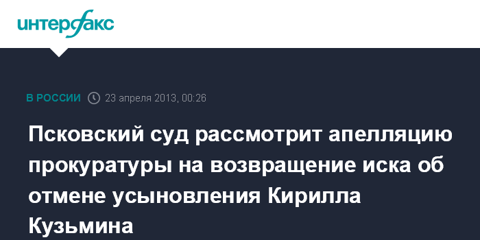 Псков. 23 апреля. INTERFAX.RU - В Псковском областном суде во вторник состоится рассмотрение апелляционного представления прокуратуры о возвращении иска об отмене усыновления в отношении Кирилла Кузьмина, брата погибшего в США Максима Кузьмина.