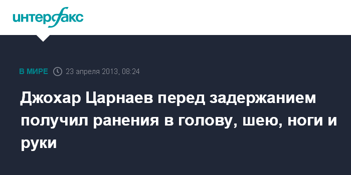 Вашингтон. 23 апреля. INTERFAX.RU - Обвиняемый в теракте в Бостоне Джохар Царнаев перед задержанием получил ранения в голову, шею, руки и ноги, говорится в опубликованном в понедельник докладе ФБР. "Было видно, что он ранен. В частности, выявлены огнестрельные ранения в голову, шею, руки и ноги", - отметил агент ФБР Дэниел Генк, курировавший это дело.