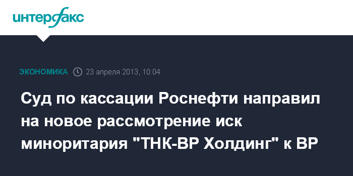 Суд по кассации Роснефти направил на новое рассмотрение иск миноритария "ТНК-ВР Холдинг" к ВР