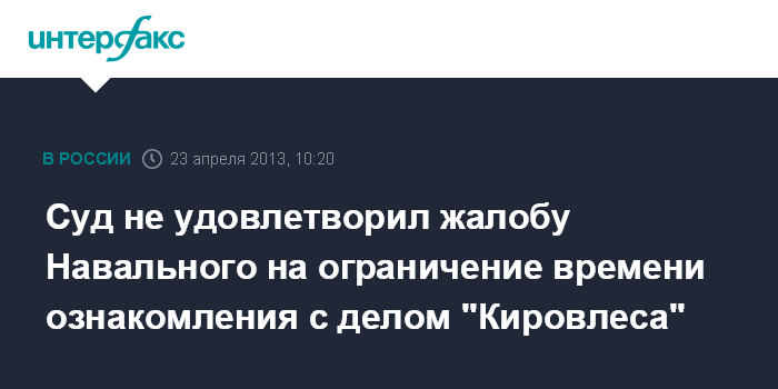Киров. 23 апреля. INTERFAX.RU - Кировский областной суд во вторник оставил без удовлетворения апелляционную жалобу защиты Алексея Навального о незаконном ограничении времени для ознакомления с материалами его уголовного дела по "Кировлесу", передает корреспондент агентства "Интерфакс-Поволжье".
