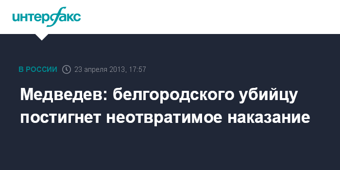 Москва. 23 апреля. INTERFAX.RU - Дмитрий Медведев выразил уверенность в том, что преступник, убивший шесть человек в Белгороде, понесет наказание.