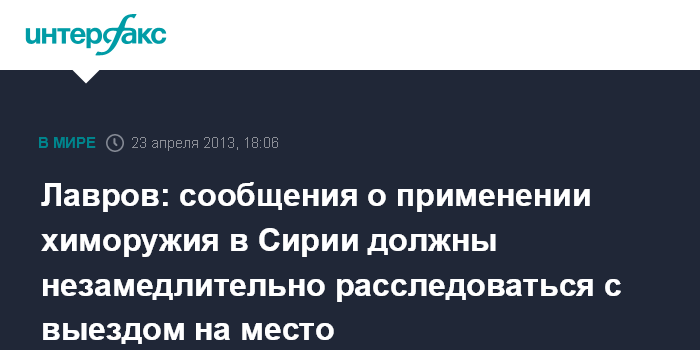 Брюссель. 23 апреля. INTERFAX.RU - Глава МИД РФ Сергей Лавров заявил о необходимости тщательно расследовать любое сообщение о применении химического оружия на территории Сирии.