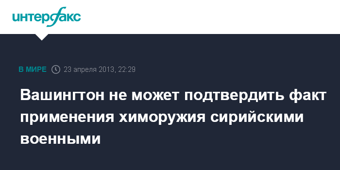 Вашингтон. 24 апреля. INTERFAX.RU - Власти США не располагают доказательствами применения химического оружия сирийскими правительственными войсками, заявил во вторник на брифинге представитель Белого дома Джей Карни.