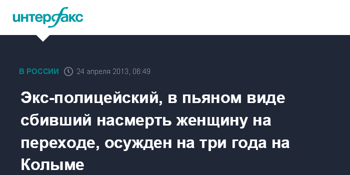 Владивосток. 24 апреля. ИНТЕРФАКС-ДАЛЬНИЙ ВОСТОК - Суд Хасынского района Магаданской области вынес обвинительный приговор бывшему полицейскому, который, будучи пьяным, сел за руль и насмерть сбил женщину на пешеходном переходе.