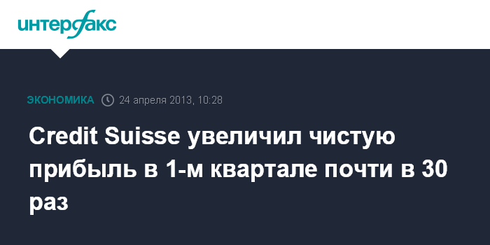 24 апреля. FINMARKET.RU - Чистая прибыль Credit Suisse Group AG, крупнейшего банка Швейцарии, в первом квартале 2013 года выросла в 29,5 раз - до 1,303 млрд швейцарских франков ($1,37 млрд) по сравнению с 44 млн франков за аналогичный период годом ранее, сообщается в пресс-релизе кредитной организации. По сравнению с предыдущим кварталом прибыль увеличилась в 5 раз.