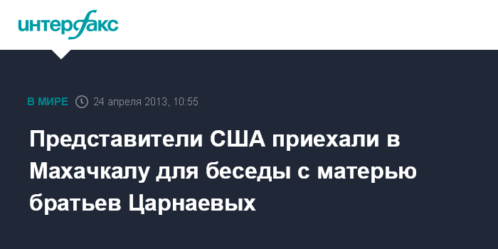 Махачкала. 24 апреля. INTERFAX.RU - Представители властей США прибыли в Махачкалу и провели беседу с матерью Тамерлана и Джохара Царнаевых Зубейдат, сообщила "Интерфаксу" руководитель независимого информационно-аналитического агентства "Объектив" Хеда Саратова.