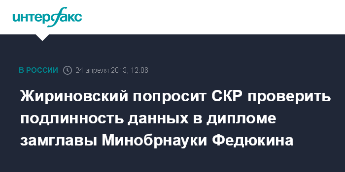 Москва. 24 апреля. ИНТЕРФАКС - Лидер ЛДПР Владимир Жириновский заявил, что в дипломе об образовании замминистра образования и науки РФ Игоря Федюкина есть признаки фальшивых сведений и готов направить соответствующие материалы в Следственный комитет.