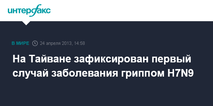 Пекин. 24 апреля. INTERFAX.RU - Власти китайского острова Тайвань в среду подтвердили первый случай заболевания птичьим гриппом H7N9, передают китайские СМИ.