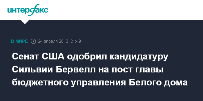 Вашингтон. 24 марта. INTERFAX.RU - Сенат США в среду единогласно утвердил Сильвию Бервелл на посту главы бюджетного управления администрации президента США, сообщает агентство Associated Press.