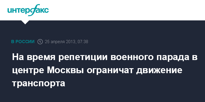 Москва. 25 апреля. INTERFAX.RU - Движение транспорта на ряде улиц в центре Москвы будет ограничено в четверг вечером в связи с проведением репетиции военного парада в честь Дня Победы, сообщает официальный портал мэра и правительства столицы.
