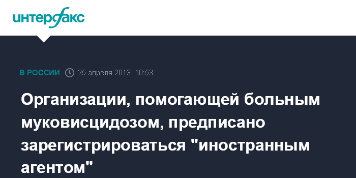 Москва. 25 апреля. INTERFAX.RU - Благотворительная организация "Помощь больным муковисцидозом (МВ)" обязана обратиться в Минюст и зарегистрироваться в качестве иностранного агента - такое предупреждение организация получила от Истринской городской прокуратуры.