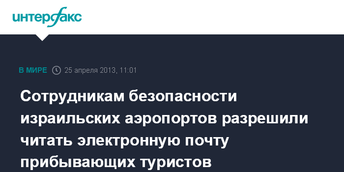 Иерусалим. 25 апреля. INTERFAX.RU - Генпрокурор Израиля Йехуда Вайнштейн подтвердил, что сотрудникам безопасности аэропортов Израиля официально разрешается требовать у приезжающих туристов доступ к их электронной почте и депортировать их в случае отказа.