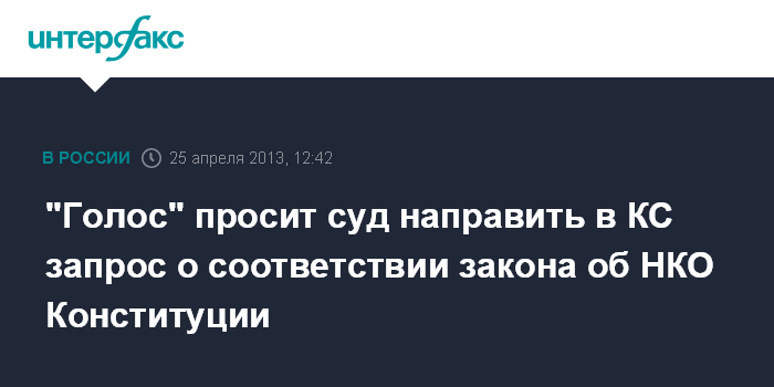 Москва. 25 апреля. INTERFAX.RU - Представитель ассоциации "Голос" попросил мировой суд направить запрос в Конституционный суд Рссии на предмет соответствия закона об иностранных агентах Конституции.