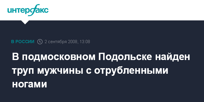 Москва. 2 сентября. INTERFAX.RU - В подмосковном Подольске найден труп мужчины с отрубленными ногами, сообщили "Интерфаксу" в управлении информации и общественных связей ГУВД Московской области.