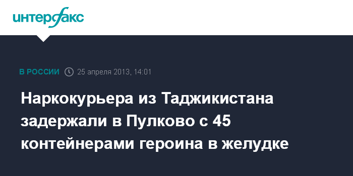 Санкт-Петербург. 25 апреля. INTERFAX.RU - В аэропорту Пулково в Санкт-Петербурге задержали гражданин Таджикистана, перевозившего в желудке несколько десятков контейнеров с героином.