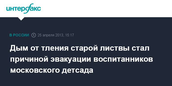 Москва. 25 апреля. INTERFAX.RU - Тление прошлогодней листвы стало причиной эвакуации воспитанников и педагогов детского сада на юго-западе столицы, сообщил в четверг "Интерфаксу" источник в правоохранительных органах.
