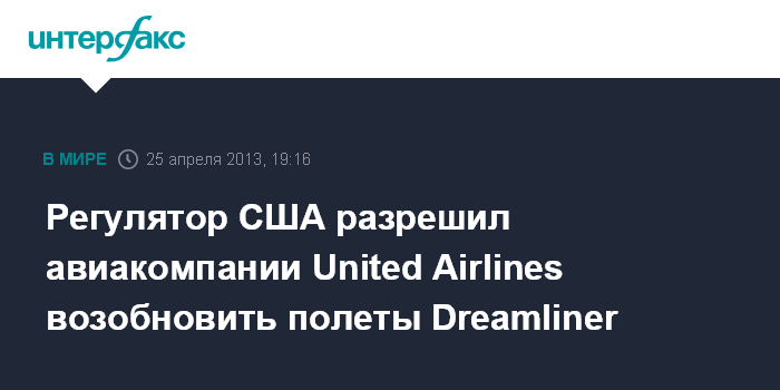 Вашингтон. 25 апреля. INTERFAX.RU - Федеральное управление гражданской авиации (FAA) США в четверг разрешило авиакомпании United Airlines возобновить полеты Boeing-787 Dreamliner, передает MarketWatch.