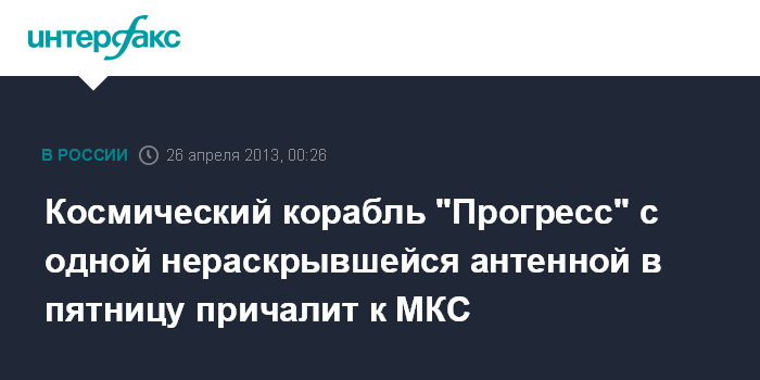 Москва. 26 апреля. INTERFAX.RU - Запущенный в среду с Байконура к МКС российский транспортный корабль "Прогресс М-19М" в пятницу причалит к станции, не раскрывшаяся на нем антенна не должна помешать стыковке, сообщили "Интерфаксу" в Ракетно-космической корпорации "Энергия".