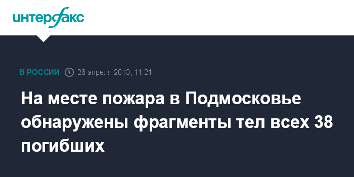 Москва. 26 апреля. INTERFAX.RU - Спасатели нашли фрагменты тел всех погибших на пожаре в подмосковной психиатрической лечебнице, сообщил "Интерфаксу" источник в силовых структурах региона.