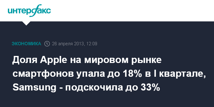 Нью-Йорк. 26 апреля. INTERFAX.RU - Доля iPhone, производимых Apple Inc., на мировом рынке смартфонов сократилась в первом квартале 2013 года до 18% с 23% за тот же период 2012 года, при этом темпы повышения их сбыта были самыми слабыми за все время существования гаджета, свидетельствуют данные аналитической компании Strategy Analytics.