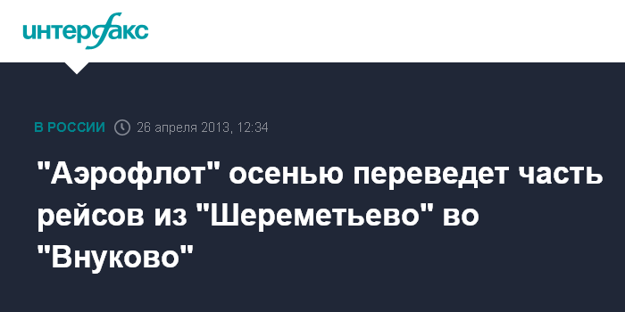 Москва. 26 апреля. INTERFAX.RU - ОАО "Аэрофлот - российские авиалинии" осенью переведет часть рейсов из "Шереметьево" во "Внуково": соответствующее решение было утверждено на заседании совета директоров в четверг, сообщила компания.