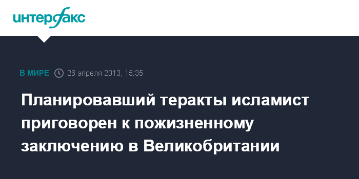 Лондон. 26 апреля. INTERFAX.RU - Судья Вулвичского королевского суда в Бирмингеме (Великобритания) приговорил радикального мусульманина Ирфана Насира к пожизненному заключению, сообщила в пятницу британская телекомпания Sky News.