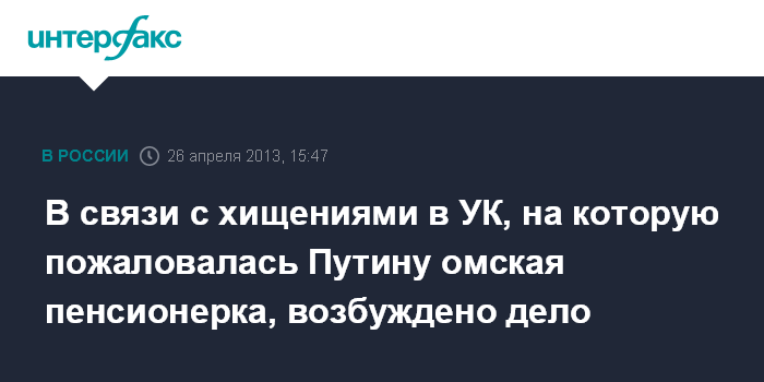 Москва. 26 апреля. INTERFAX.RU - Возбуждено уголовное дело по факту хищения в управляющей компании Омска, о чем говорила в своем диалоге с президентом России пенсионерка Алевтина Рапацевич.