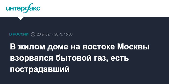 Москва. 26 апреля. INTERFAX.RU - Взрыв бытового газа произошел в одном из жилых домов на востоке Москвы, сообщили "Интерфаксу" в пресс-службе ГУ МВД по Москве.