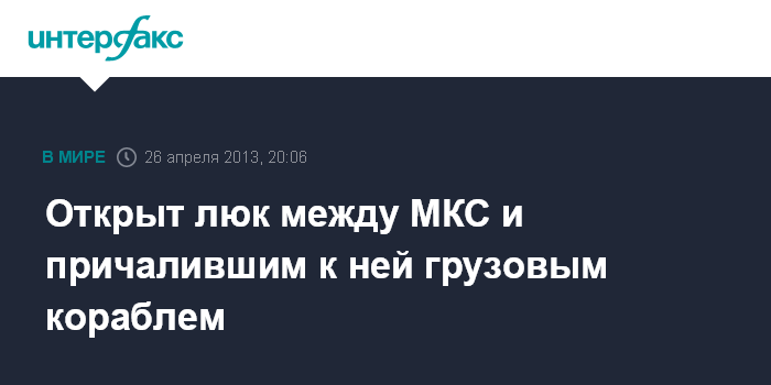 Москва. 26 апреля. INTERFAX.RU - Экипаж Международной космической станции (МКС) открыл люк в грузовой корабль "Прогресс-М-19М", сообщили "Интерфаксу-АВН" в Центре управления полетами (ЦУП).