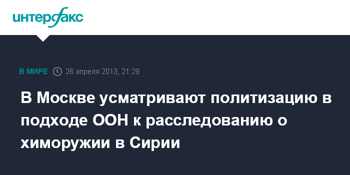Москва. 26 апреля. INTERFAX.RU - Россия обвиняет Секретариат ООН в политизированном подходе к расследованию сообщений о применении химического оружия в Сирии.