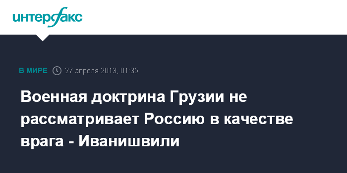 Тбилиси. 27 апреля. ИНТЕРФАКС - В нынешней военной доктрине Грузии Россия больше не рассматривается в качестве врага, как это было в прежнем документе, разработанном Советом национальной безопасности, заявил премьер-министр Грузии Бидзина Иванишвили в передаче "Позиция" телекомпании "Рустави-2" поздно вечером в пятницу.