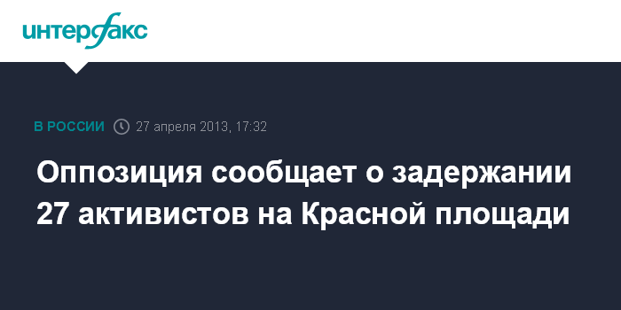 Москва. 27 апреля. INTERFAX.RU - Почти три десятка оппозиционеров и гражданских активистов были задержаны в субботу в Москве на Красной площади, сообщил "Интерфаксу" член бюро движения "Солидарность" Сергей Давидис. "Задержаны 27 человек, среди них есть активисты "Солидарности", в частности, Надежда Митюшкина и Денис Юдин", - сказал С.Давидис.
