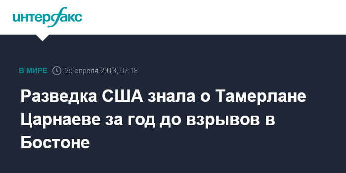 Лондон. 25 апреля. ИНТЕРФАКС - ФБР и ЦРУ знали о подозреваемом в организации взрывов на марафоне в Бостоне Тамерлане Царнаеве по крайней мере за год до нападения, но ни одна из организаций не предприняла никаких действий после первичных запросов, сообщает британская телерадиовещательная корпорация Би-би-си.