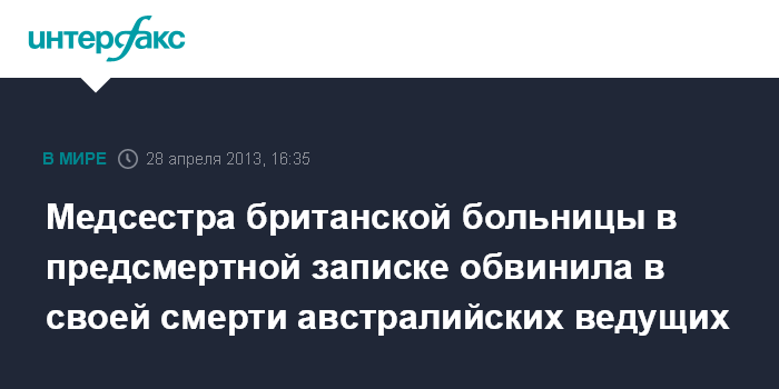 Сидней. 28 апреля. INTERFAX.RU - Покончившая с собой медсестра больницы имени короля Эдуарда VII в Лондоне Джасинта Салданха в предсмертной записке обвинила в своей смерти разыгравших ее ведущих австралийской радиостанции 2Day FM, сообщает в воскресенье телеканал Sky News Australia.
