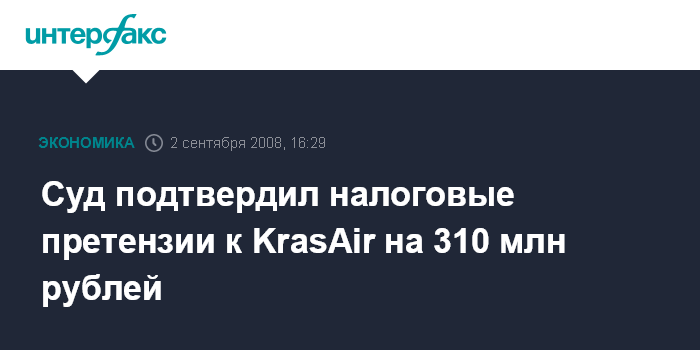 Москва. 2 сентября. INTERFAX.RU - Арбитражный суд Москвы сегодня подтвердил налоговые претензии к ОАО "Красноярские авиалинии" (KrasAir) за период с 1 января 2004 г. по 30 сентября 2005 г. примерно на 310 млн руб., сообщили журналистам в суде.