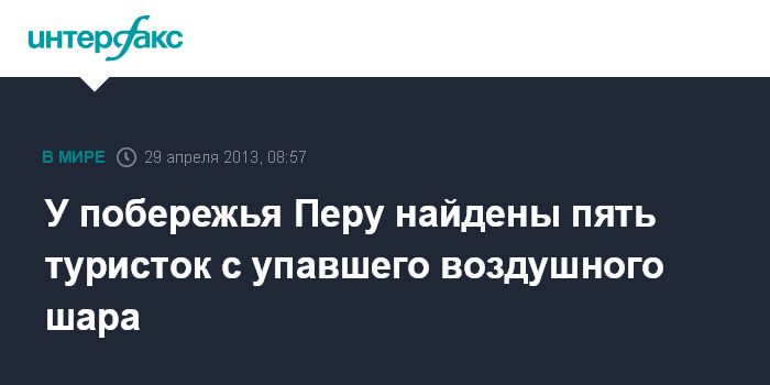 Лондон. 29 апреля. INTERFAX.RU - Пять туристок были найдены в Тихом океане после крушения прогулочного воздушного шара у берегов Перу, сообщает британская телерадиокорпорация BBC.