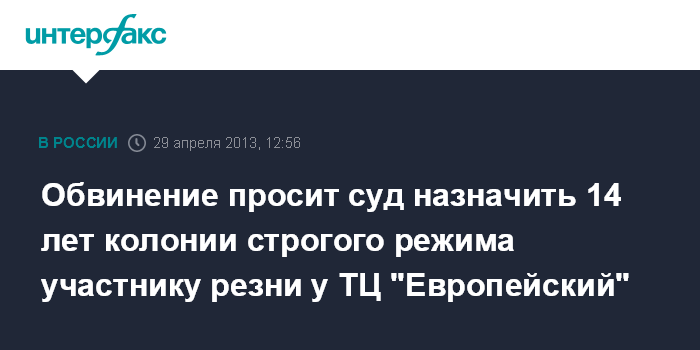 Москва. 29 апреля. INTERFAX.RU - Прокурор в Мосгорсуде попросил 14 лет колонии строгого режима для Бекхана Ризванова, которого присяжные признали виновным в покушении на убийство из хулиганских побуждений в рамках дела о драке у ТЦ "Европейский" в Москве.