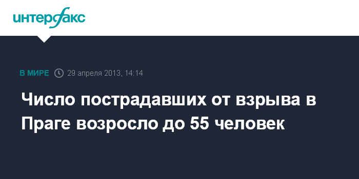 Прага. 29 апреля. INTERFAX.RU - По последним данным, 55 человек получили ранения в результате взрыва в центре столицы Чехии, сообщает в понедельник американский телеканал CNN со ссылкой на пожарную службу города.