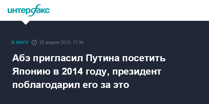 Москва. 29 апреля. INTERFAX.RU - Премьер-министр Японии Синдзо Абэ сообщил, что пригласил президента России Владимира Путина в Токио с визитом в 2014 году.